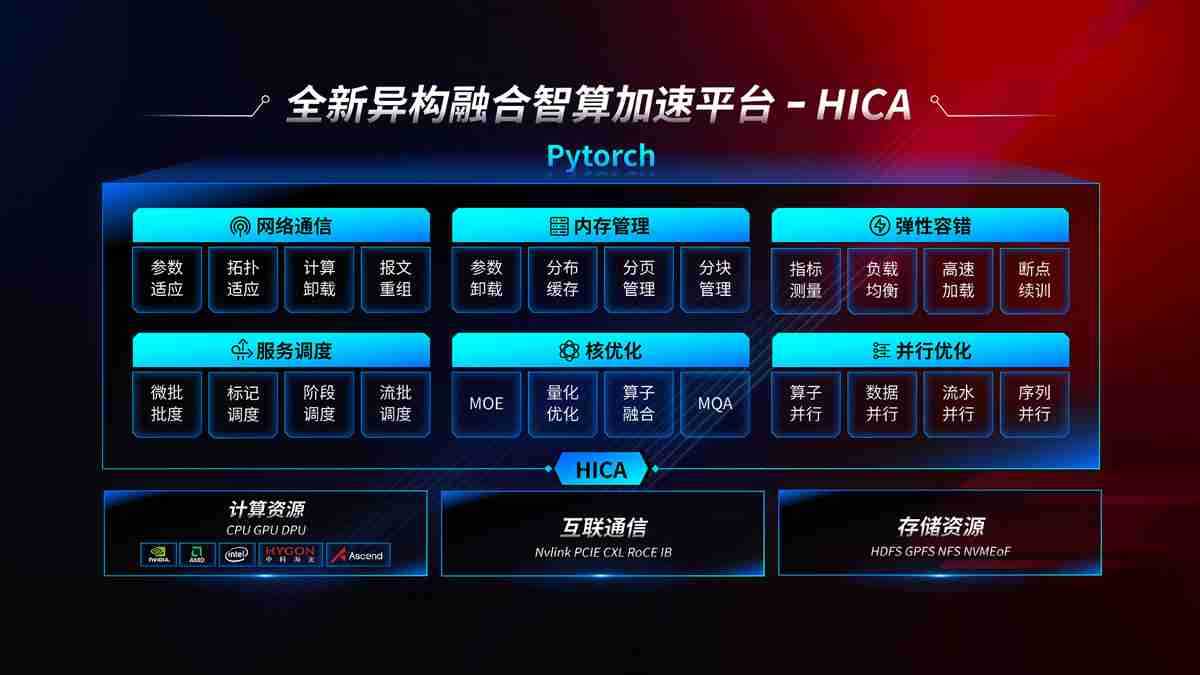 通过自研的服务层、、、中间适配层、、、、以及调度编排算法,,,采用数据并行、、模型并行等多种并行方式,,,把并行计算任务进行有效的分解,,,使其分别由相应的软件栈和算力资源来承接。。。当GPU资源变化,,,HICA可以实时动态调度计算子任务并调整模型拓扑和架构,,以充分聚合各种算力资源。。。。