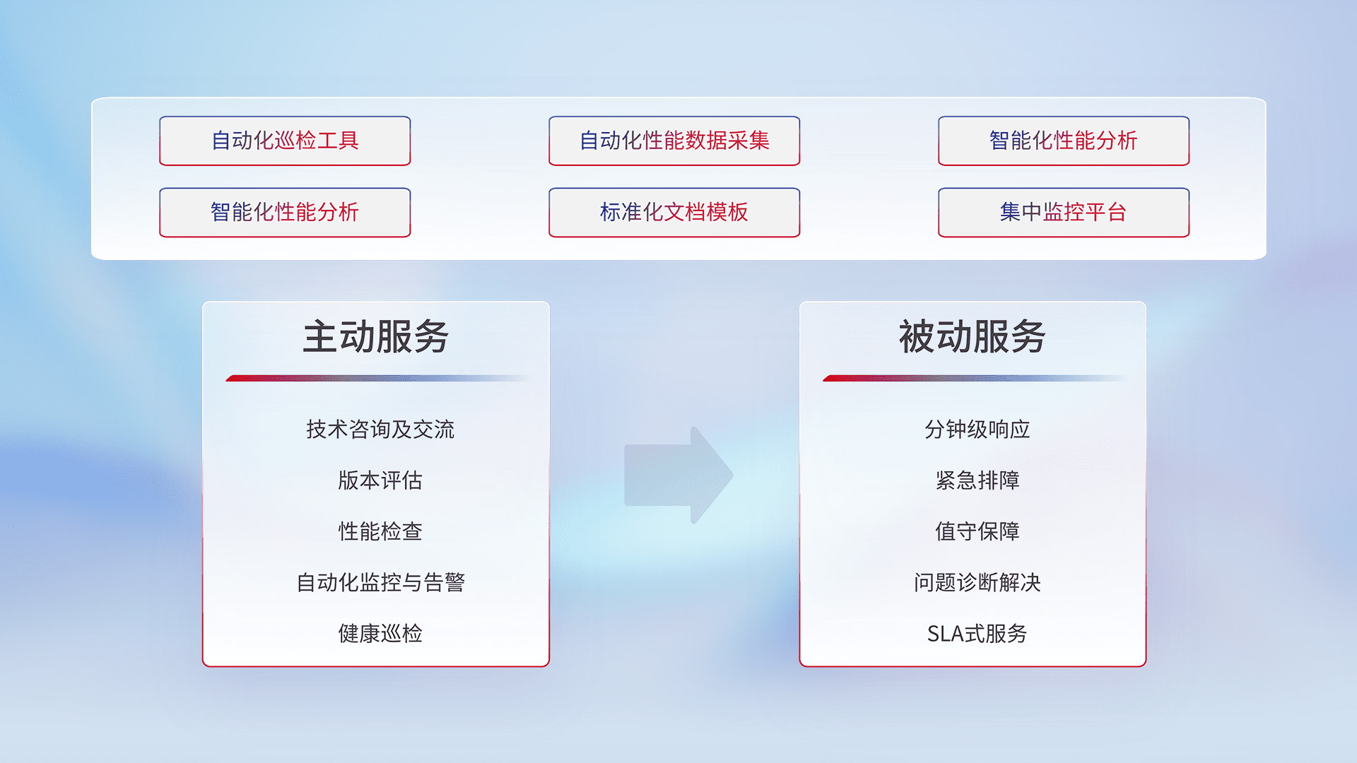 智能化工具和标准化文档,,保障服务质量,,,,提供主动服务(包含技术咨询、、、版本评估、、、、性能检查、、、自动化监控与告警、、健康巡检)和被动服务包含(分钟级响应、、、、紧急排障、、、值守保障、、、问题诊断解决、、SLA服务)。。